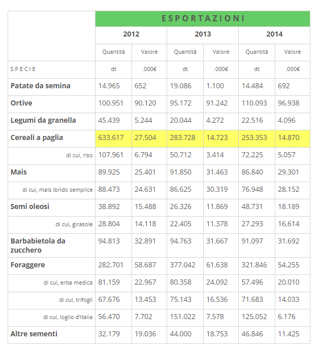 Aumentate poi del 50% in valore sul 2013 le esportazioni di sementi di riso (5 mio/euro), di cui l’Italia è leader in Europa per la produzione.