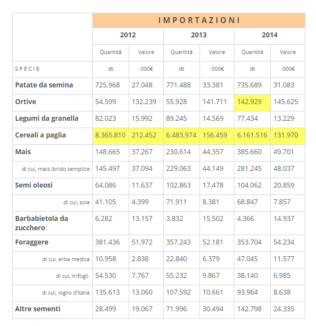 Import export sementi in Italia 2012-2014